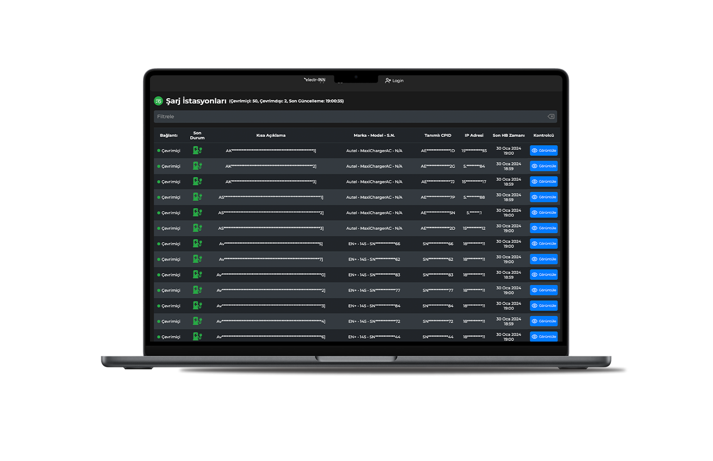 Tüm şarj alanı ve noktalarına erişim ve tam hakimiyet. Uzaktan takip ve kontrol imkanı.